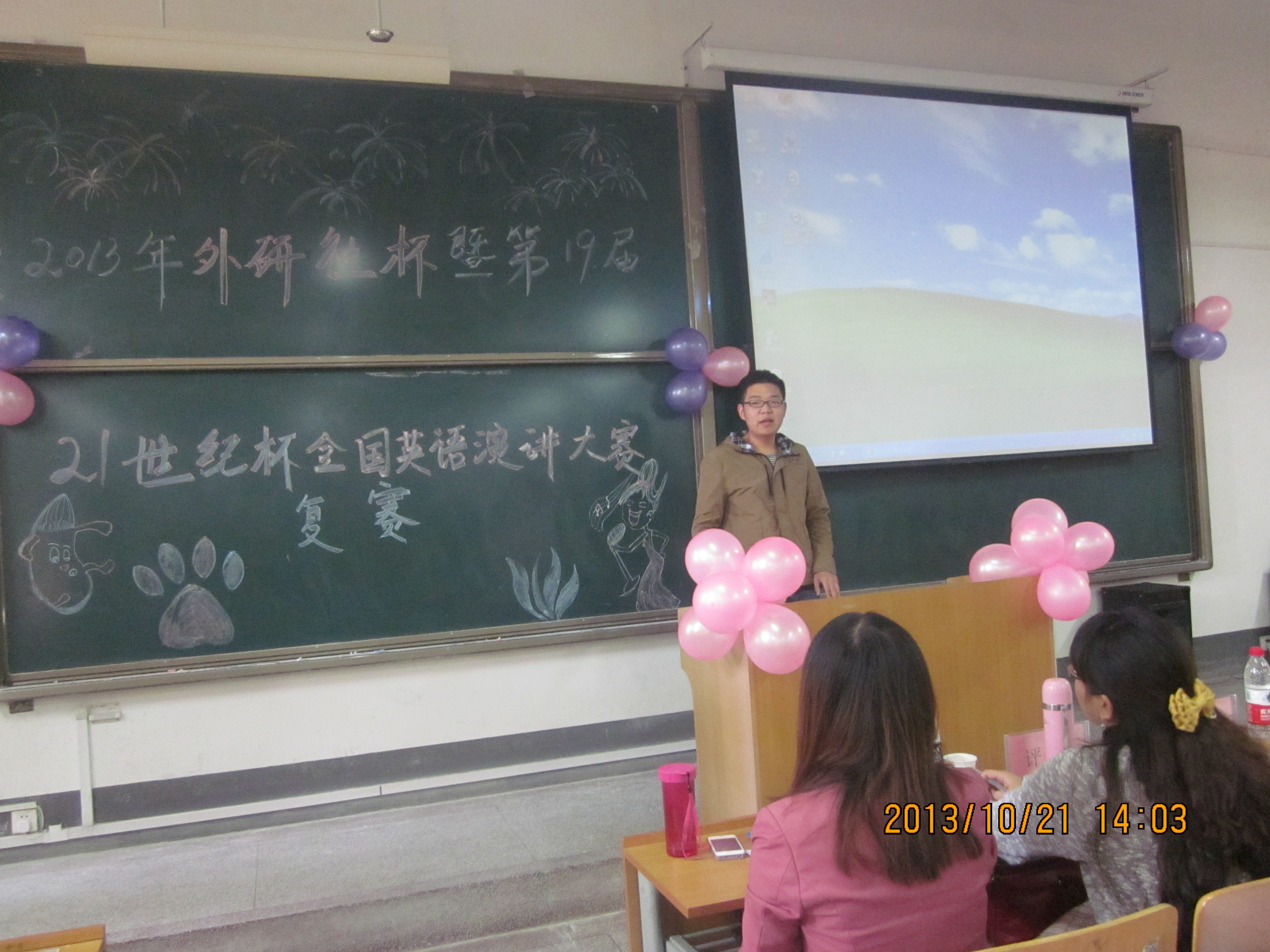 2013年10月21日下午,“2013年外研社杯暨第19届21世纪杯全国英语演讲大赛”复赛在临潼校区D3108教室举行。