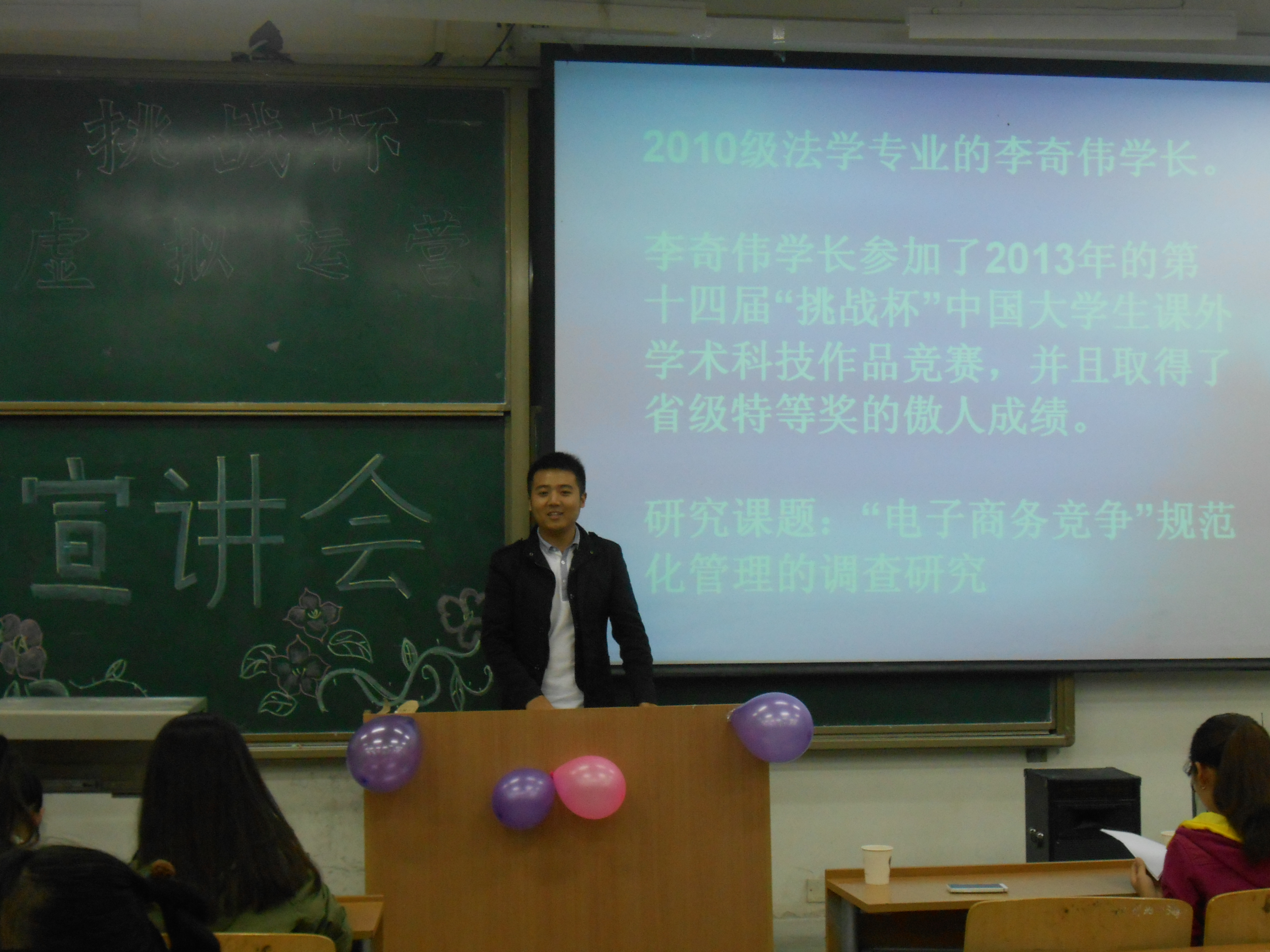 为了加深大一新生对挑战杯的了解,williamhill官方网站科协于2013年10月14日晚在B栋235教室召开了挑战杯及虚拟运营宣讲会。