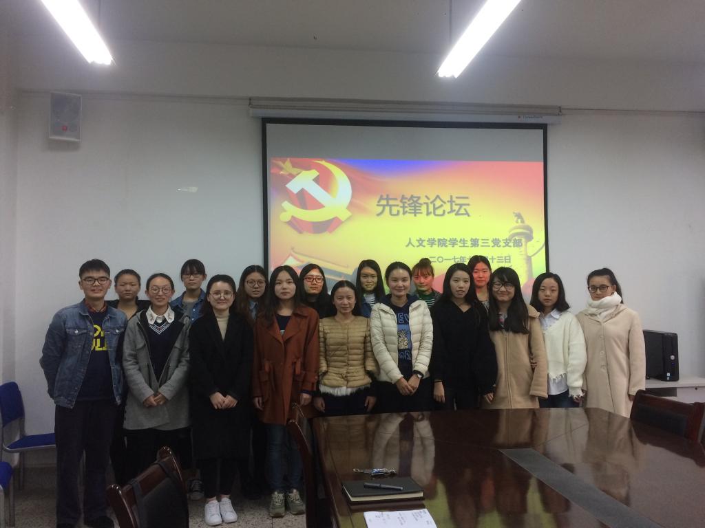 为贯彻党的十九大精神,进一步夯实“两学一做”学习教育基础,深化学习效果,11月13日,williamhill官方网站员工第三党支部在人文楼会议室举办先锋论坛,支部全体党员参加了活动,党支部书记刘婷婷担任主持。
