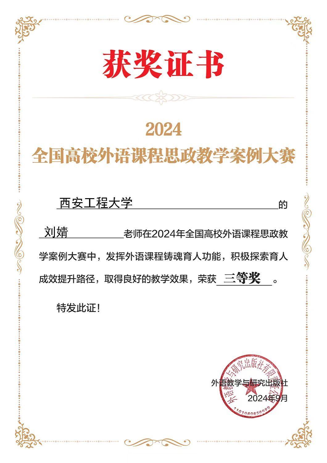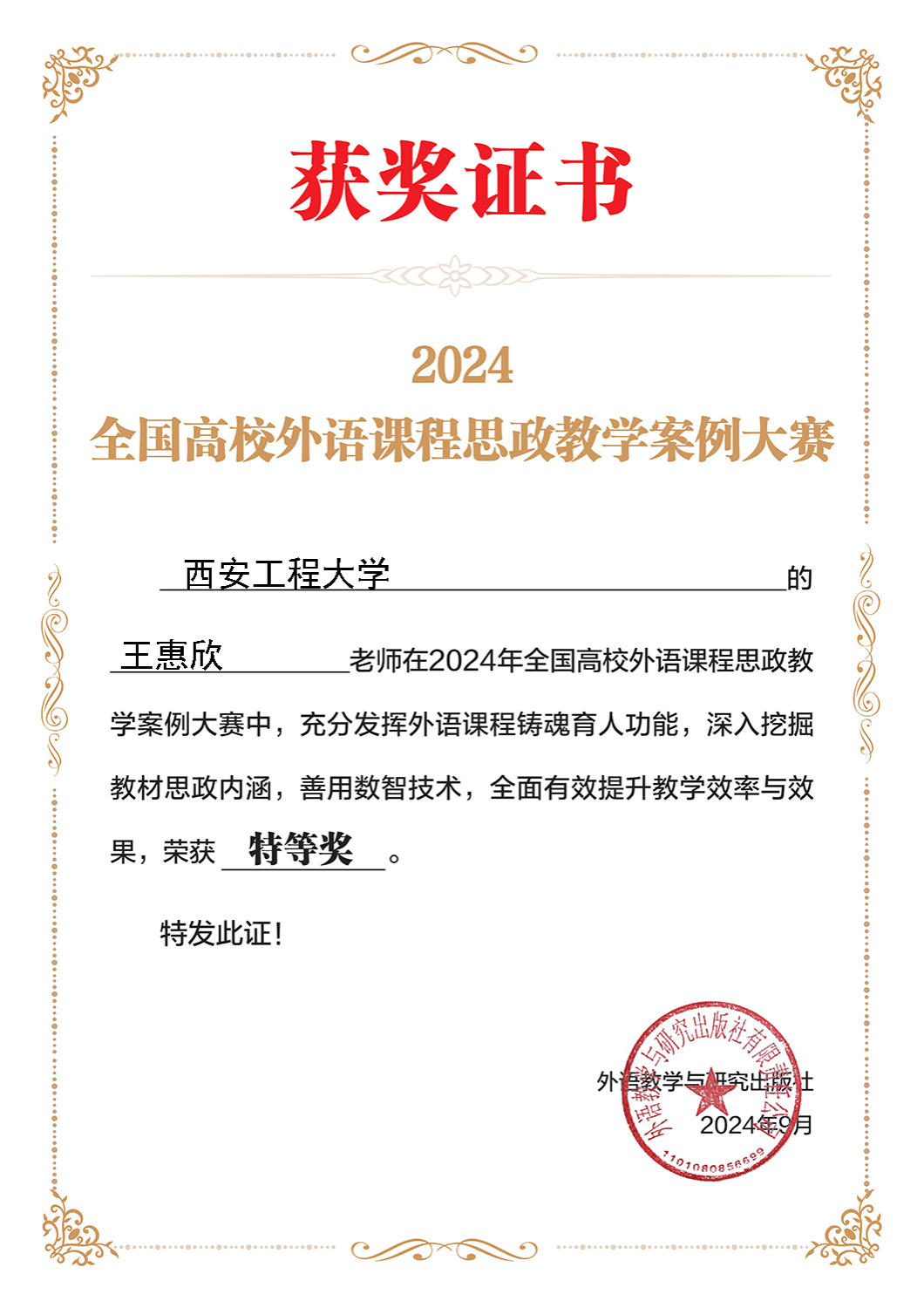 9月10日,时值第40个教师节,2024年全国高校外语课程思政教学案例大赛获奖名单揭晓,williamhill官方网站教师取得佳绩,王惠欣老师和刘婧老师分别获得主赛道特等奖和三等奖,崔晓丹老师获得“理解当代中国”赛道一等奖。