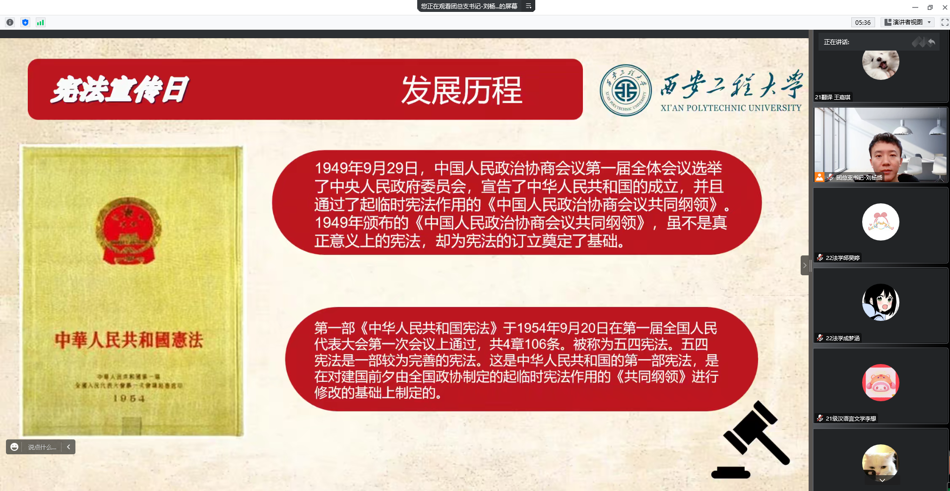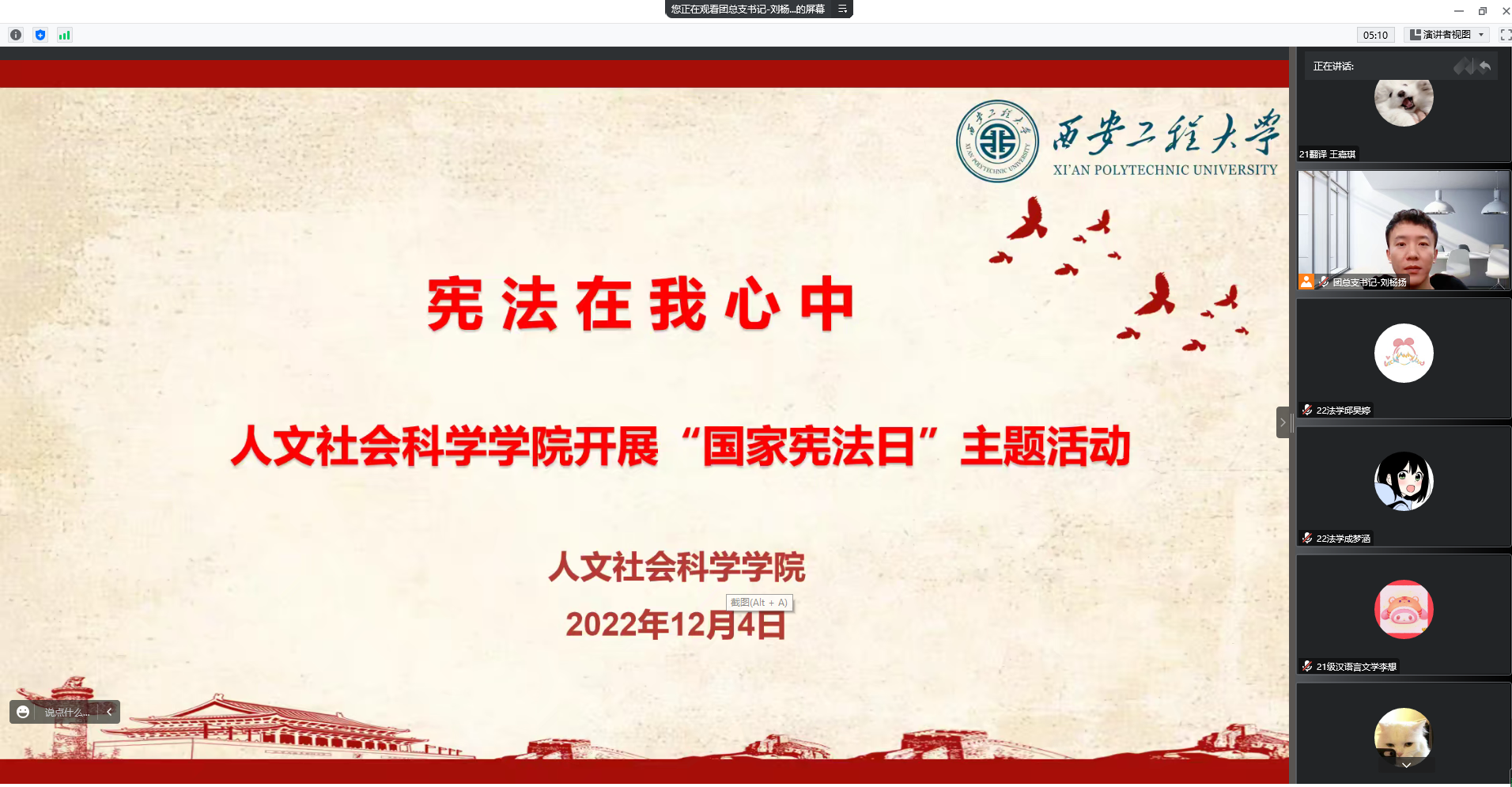 2022年,是我国现行宪法颁布实施40周年。为深入学习宣传贯彻党的二十大精神,弘扬宪法精神,维护宪法权威,增强法治意识,2022年12月4日,williamhill官方网站开展以“宪法在我心中”为主题的“国家宪法日”主题活动。公司团总支书记刘杨扬作为主讲人,2021级、2022级部分员工代表参与此次活动。