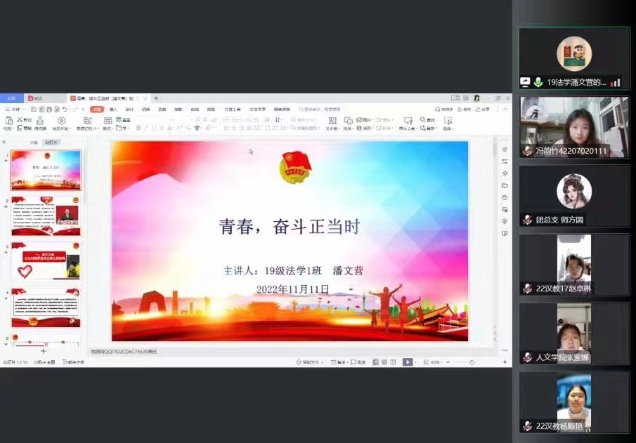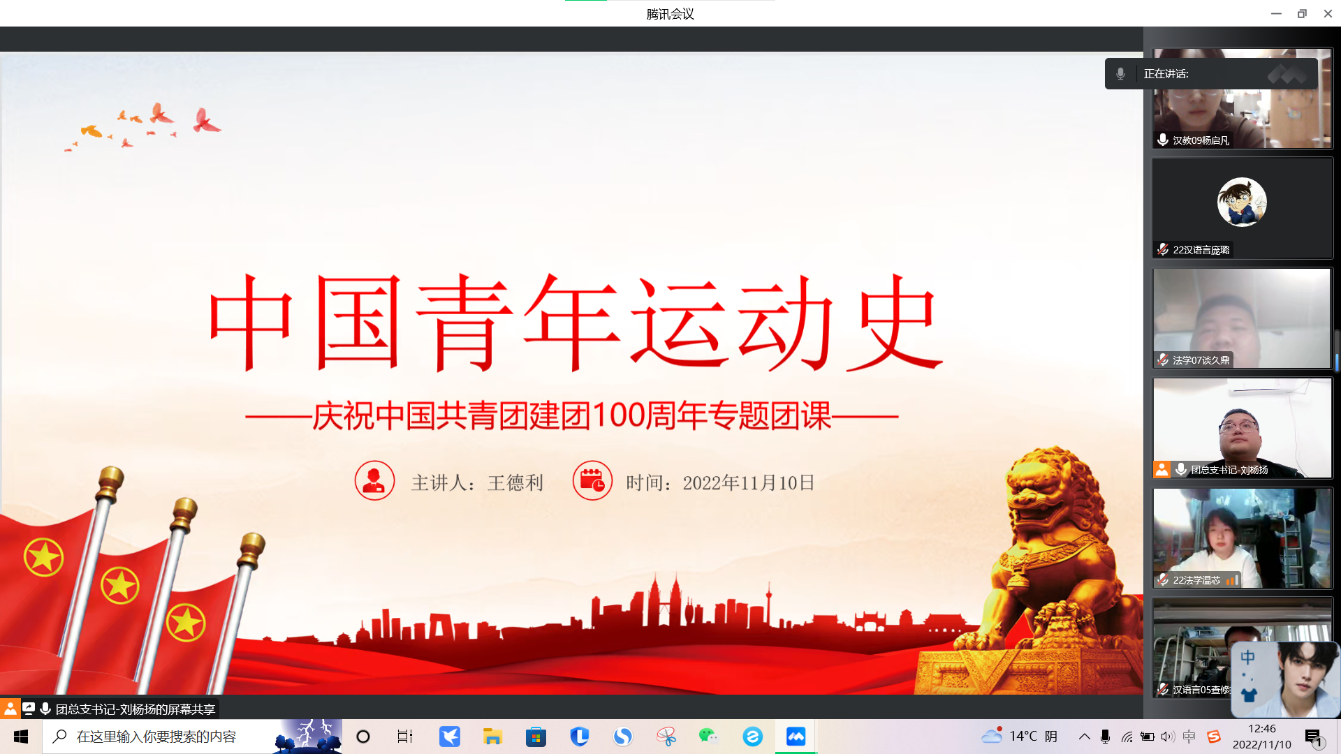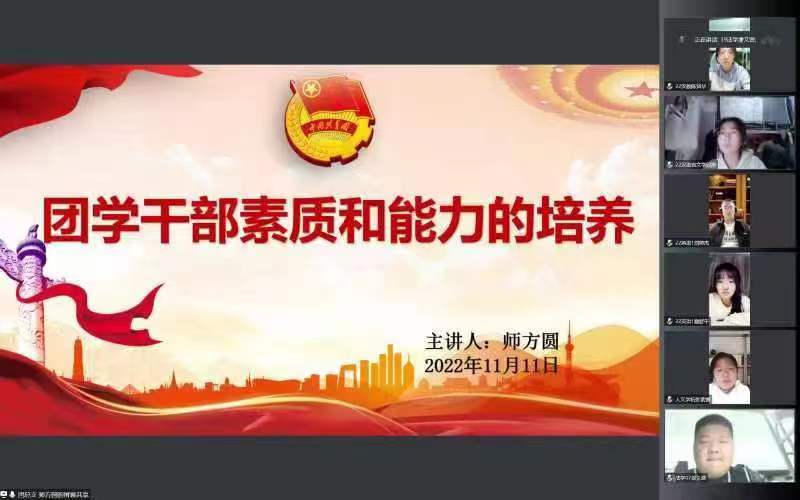 为响应团中央的号召,引导广大团员青年坚定听党话跟党走,深入学习宣传贯彻党的二十大精神,11月10日-15日,williamhill官方网站以线上形式举办了2022年度院级团课。本期团课共分为四讲,分别由辅导员王德利、团总支书记刘杨扬、2020级团干部师方圆及优秀员工代表潘文营担任主讲人,2022级本科生及研究生参加此次活动。
