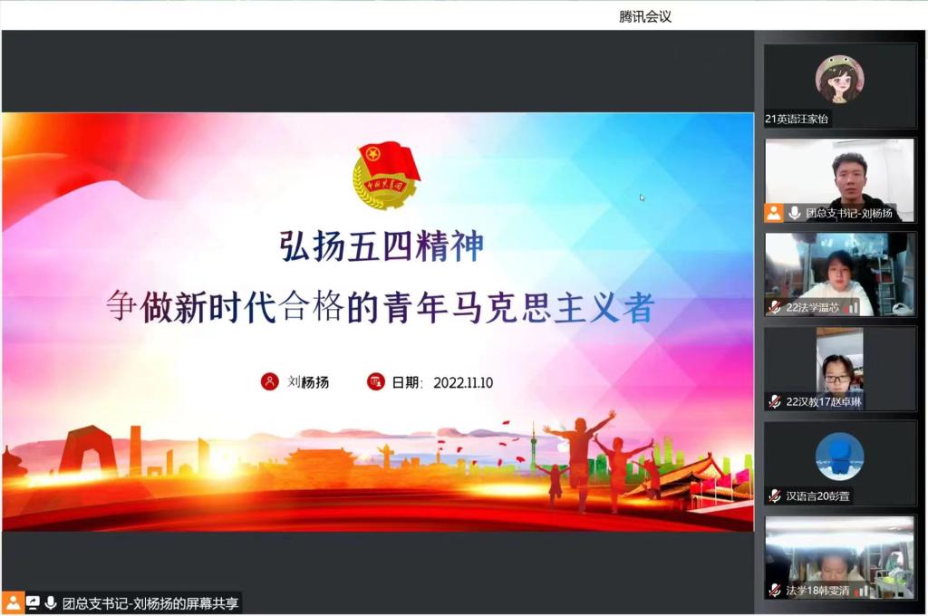 团课第二讲,刘杨扬以“弘扬五四精神,争做新时代合格的青年马克思主义者”为主题,以五四精神时代内涵为开篇,带领团员们回顾时代先锋,并提出青年应不忘初心,坚定理想信念、敢为人先、砥砺奋进。接着他以新冠疫情防控为背景,说明中国共产党从人民的根本利益出发,以人民为中心,展现了中国在全球疫情大爆发情况下的制度自信。最后他对“时代赋予了当代青年人怎样的历史使命及当代青年应怎样做”进行了讲解,号召团员们要用信仰为青春定向,用知识为青春赋能,用奋斗为青春添彩,始终坚持用马克思主义中国化最新成果武装头脑,努力做一名合格的青年马克思主义者。