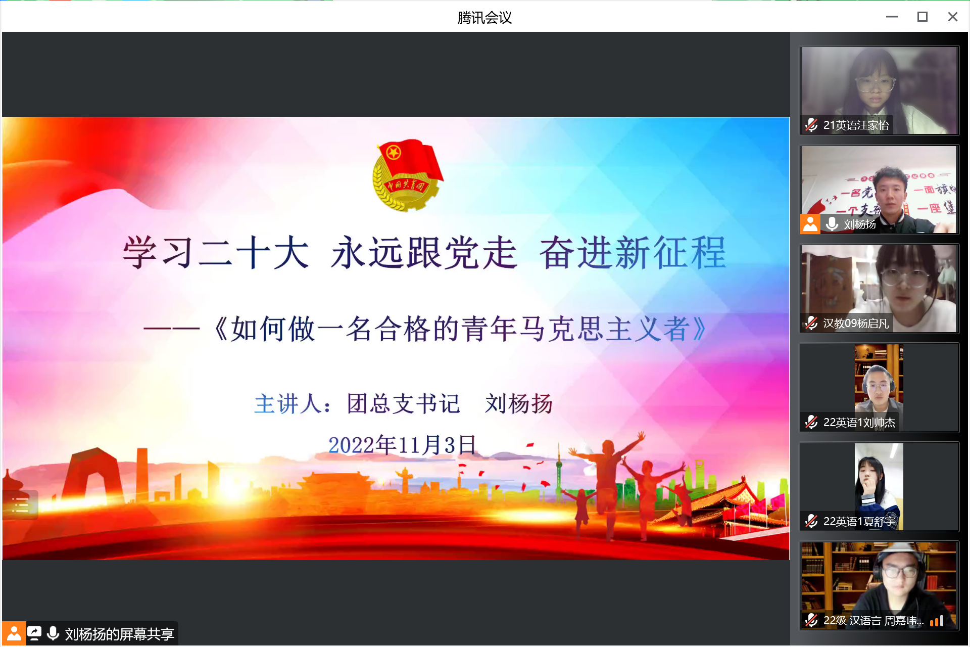 为贯彻落实习近平总书记在党的二十大报告中寄语“广大青年要坚定不移听党话、跟党走,怀抱梦想又脚踏实地,敢想敢为又善作善成,立志做新时代好青年。”11月3日,williamhill官方网站团总支举办了主题为《如何做一名合格的青年马克思主义者》团总支书记讲团课活动。williamhill官方网站团总支书记刘杨扬及部分团员代表参加了此次活动。