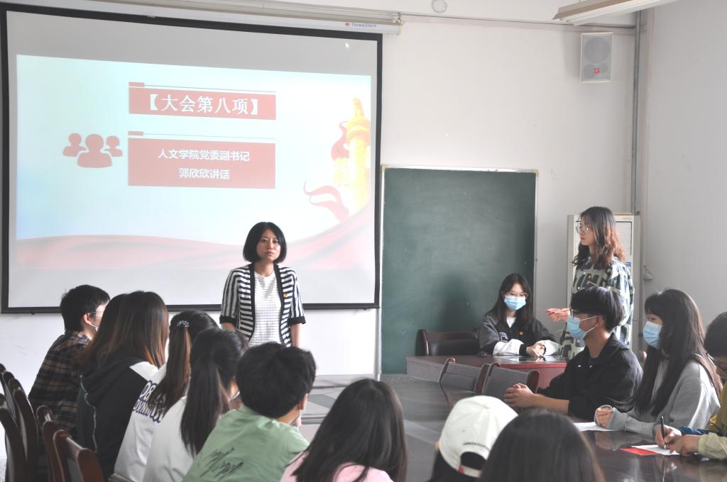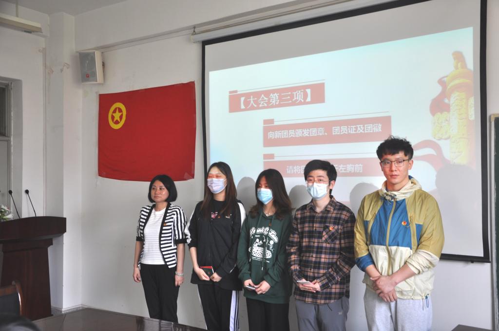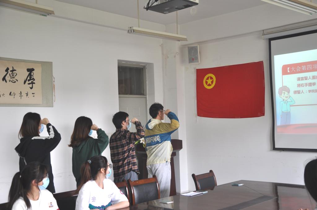 入团仪式在雄壮的国歌声中拉开帷幕。首先,主持人宣读了新团员名单并强调了举行“入团仪式”的意义。接着由公司党委副书记郭欣欣与团总支书记刘杨扬为新团员颁发团章、团员证与团徽;在刘杨扬的带领下,新团员面向鲜艳的团旗进行了庄严的宣誓。2020级汉语言文学团支部书记汪刘星作为入团介绍人代表,宣读了《团章》相关条款;2020级汉语言文学谭斯璐同学代表新团员做了发言,表达了自己入团激动的心情与对未来的展望;2020级汉语国际教育刘珍同学代表老团员做了发言。随后,公司党委副书记郭欣欣与团总支书记刘杨扬对新入团的同学表示祝贺,同时,郭欣欣老师对新团员提出了三点期望:一要树立远大理想,坚定共产主义信念;二要弘扬家国情怀,强化责任担当;三要练就过硬本领,努力学习文化知识,做一名勇于实践,知行合一的共青团员。