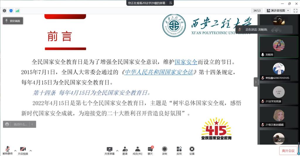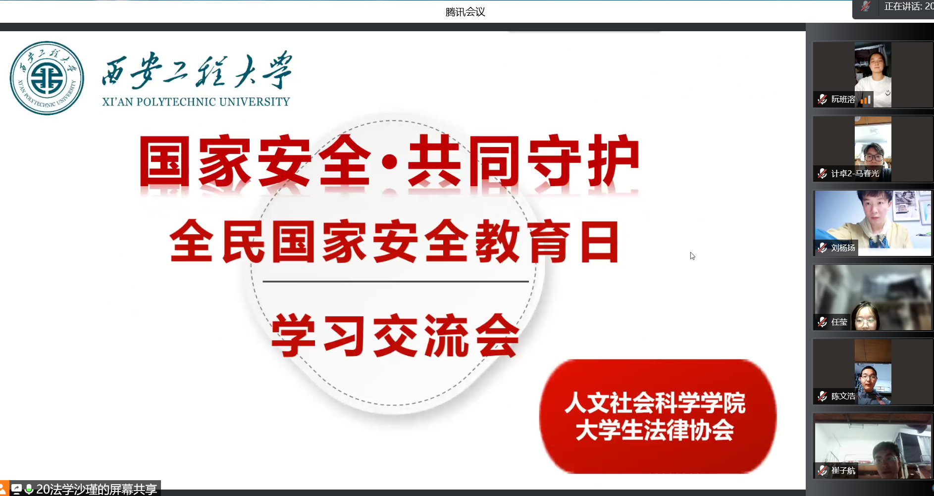 4月14日,在我国第七个全民国家安全教育日来临之际,为推动国家安全宣传教育工作深入开展,增强员工国家安全意识和法治意识,williamhill官方网站团总支与老员工法律协会共同组织开展了“国家安全·共同守护——全民国家安全教育日”线上学习交流活动,各班级员工代表参加了此次活动。